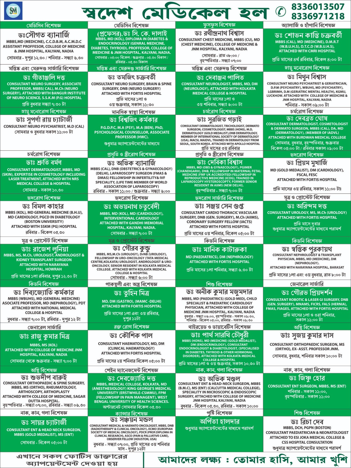 Swadesh Medical Hall is a well-known name in the healthcare industry of Kalyani. Our pharmacy and doctors' chambers are equipped with the best medical facilities and more than 20 experienced doctors are available every day for consultation. Our team comprises doctors from different categories including Child Specialists, Nephrologists, Asthma Specialists, Psychiatrists, Orthopedic Surgeons, and General Laparoscopic Surgeons. We also have Lady Gynecologists and Gynecological Laparoscopic Surgeons for women's health.